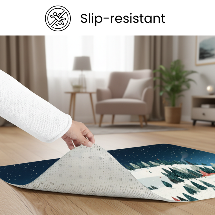 Whether you're placing it in a bedroom, living room, entryway, or playroom, this rug is built to handle busy households with ease. The quick-dry material stays fresh, and the fade-resistant colors keep the winter scene looking beautiful season after season. Cleaning is simple—just shake out debris, spot clean with mild soap when needed, and vacuum regularly. No fuss, no stress.