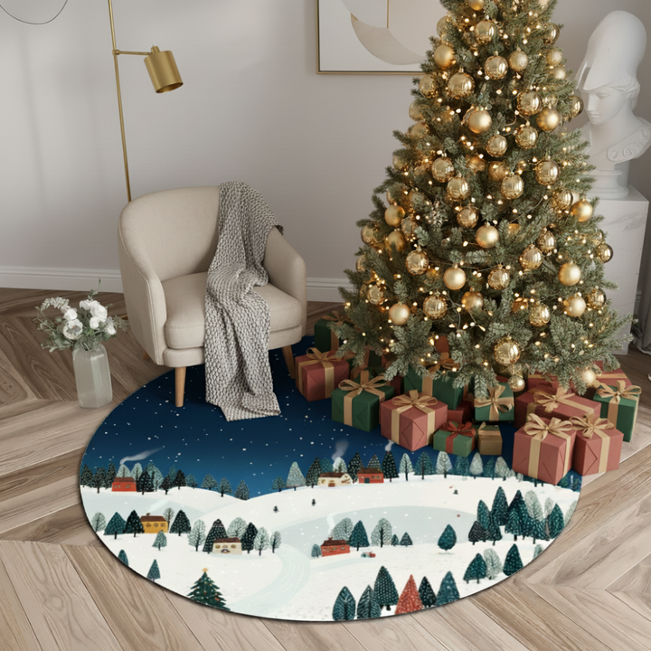 Transform your space with our enchanting Winter Night Village Rug, featuring a serene snowy landscape with cozy cottages nestled among evergreen trees under a starlit sky. This charming design captures the warmth and wonder of the holiday season, creating an inviting atmosphere that feels like home.
